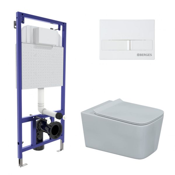 Полный комплект BERGES для монтажа подвесного унитаза. 1. Инсталляция NOVUM525Толщина бачка 80 мм.Межосевое расстояние под крепежные шпильки унитаза 18 и 23 см.Резервуар воды объемом 10 литров с тепло-шумоизоляцией.Уровень шума при давлении 3 бар не превышает 13 дБ.Подвод воды сверху (G1/2 наружная).Объем смыва 3/6 литра с возможностью регулировки. Металлический каркас, окрашенный антикоррозийной эмалью, расчетная нагрузка до 400 кг.Ножки регулировки высоты из оцинкованной стали. Возможность установки в угол. 2. кнопка L1 белаяABS-пластик 3. унитаз FLOE Rimless,безободковая система смыва, антибактериальное покрытиеэкономия воды, скрытый крепеж 4. сиденье дюропласт Floe Slim SOмикролифт, быстросъем. Все крепежи для установки в комплекте