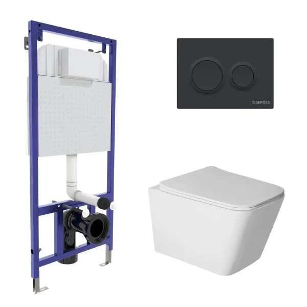 Полный Комплект BERGES для монтажа подвесного унитаза: инсталляция NOVUM525: толщина бачка 80 мм, резервуар воды объемом 10 литров с тепло-шумоизоляцией, объем смыва 3/6 литра с возможностью регулировки, нагрузка 400 кг, антикоррозийное покрытие, кнопка O5 Soft Touch черная, ABS-пластик, унитаз SIGMA Rimless 52 см: безободковый смыв, сиденье дюропласт: микролифт, быстросъемное. Все крепежи для установки в комплекте. Возможность установки в угол. Гарантия 10 лет.Безободковая система смыва, антибактериальное покрытие, экономия воды, скрытый крепеж
