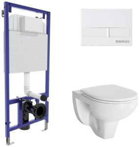 Полный комплект BERGES для монтажа подвесного унитаза. 1. Инсталляция NOVUM525Толщина бачка 80 мм.Межосевое расстояние под крепежные шпильки унитаза 18 и 23 см.Резервуар воды объемом 10 литров с тепло-шумоизоляцией.Уровень шума при давлении 3 бар не превышает 13 дБ.Подвод воды сверху (G1/2 наружная).Объем смыва 3/6 литра с возможностью регулировки. Металлический каркас, окрашенный антикоррозийной эмалью, расчетная нагрузка до 400 кг.Ножки регулировки высоты из оцинкованной стали. Возможность установки в угол. 2. кнопка L1белая 3. унитаз GAMMAкаскадный смыв, открытый ободокантибактериальное покрытиеэкономия воды 4. сиденье дюропласт Gammaмикролифт, быстросъем Все крепежи для установки в комплекте