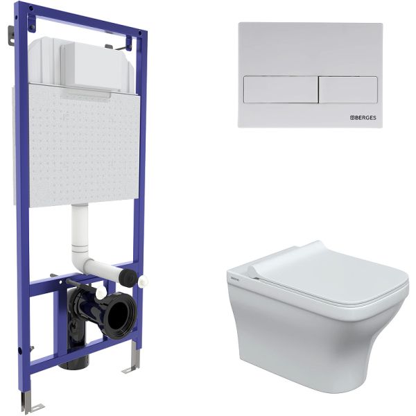 Комплект унитаза с инсталляцией Berges Wasserhaus Novum 042455 с сиденьем Микролифт и Белой клавишей смыва.Характеристики:Унитаз Strati Rimless:Цвет: белый