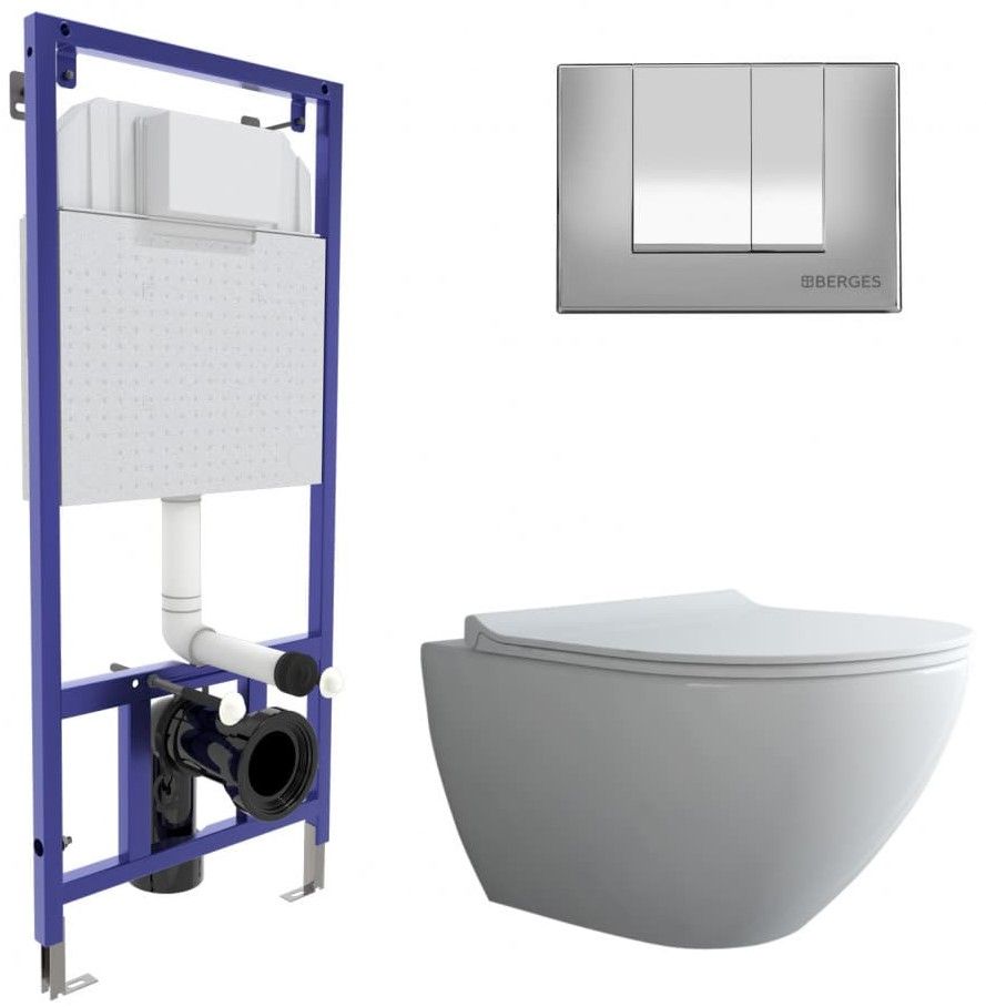 Комплект Berges 4в1 043247: инсталляция NOVUM525 кнопка S3 хром глянец унитаз Puma XL Rimless сиденье Toma Slim SO