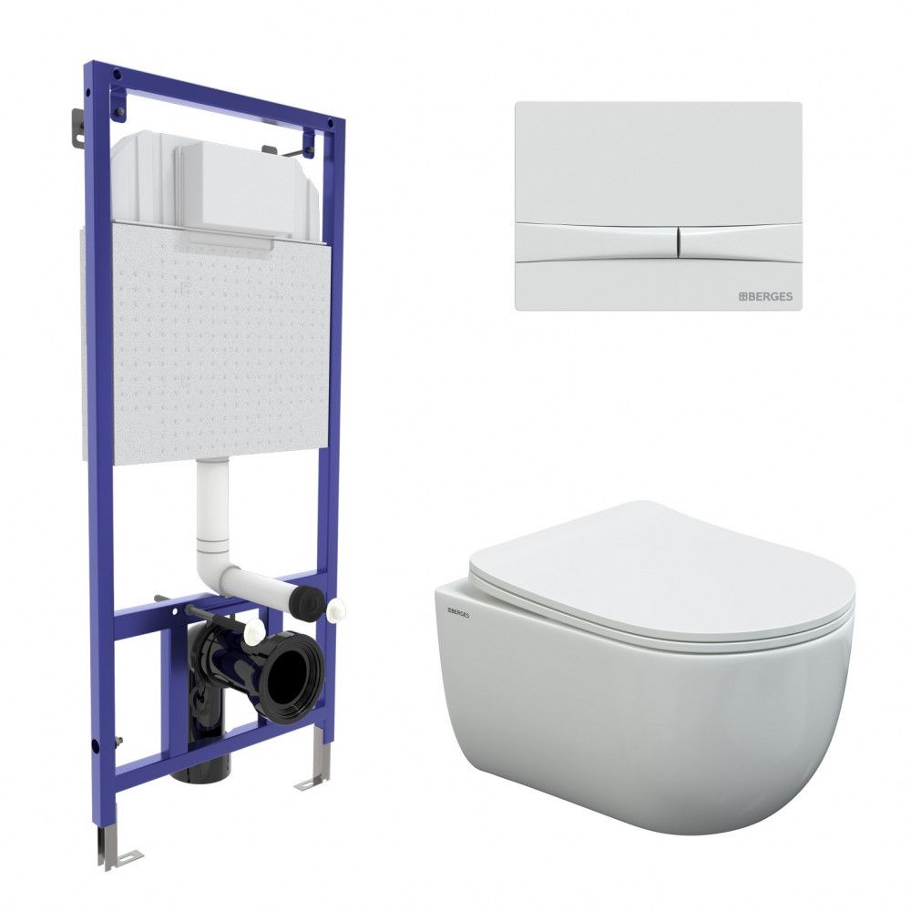 Полный комплект BERGES для монтажа подвесного унитаза. 1. Инсталляция NOVUM525Толщина бачка 80 мм.Межосевое расстояние под крепежные шпильки унитаза 18 и 23 см.Резервуар воды объемом 10 литров с тепло-шумоизоляцией.Уровень шума при давлении 3 бар не превышает 13 дБ.Подвод воды сверху (G1/2 наружная).Объем смыва 3/6 литра с возможностью регулировки. Металлический каркас, окрашенный антикоррозийной эмалью, расчетная нагрузка до 400 кг.Ножки регулировки высоты из оцинкованной стали. Возможность установки в угол. 2. кнопка F1 белаяABS-пластик 3. унитаз , VENTAS Rimlessбезободковая система смыва, антибактериальное покрытиеэкономия воды, скрытый крепеж 4. сиденье дюропласт Ventas Slim SOмикролифт, быстросъем Все крепежи для установки в комплекте