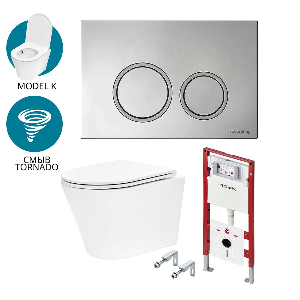 Комплект для установки подвесного унитаза: застенный модуль, панель смыва TECEspring R, хром глянцевый с хромированным контуром клавиш, унитаз TECEspring K