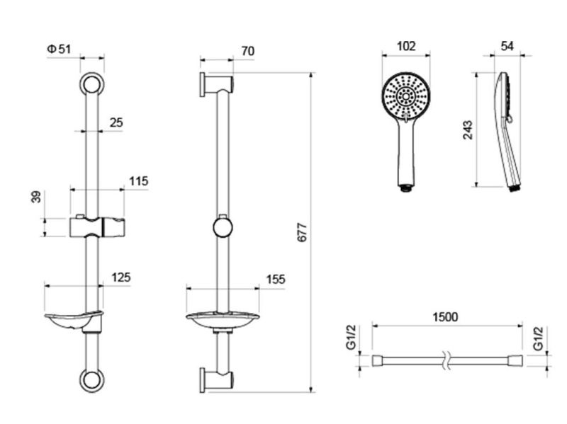 • Душевой гарнитур: душевая стойка с мыльницей, лейка, шланг