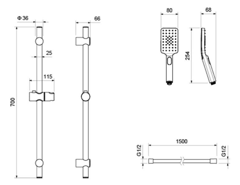 • Душевой гарнитур: душевая стойка, лейка, шланг