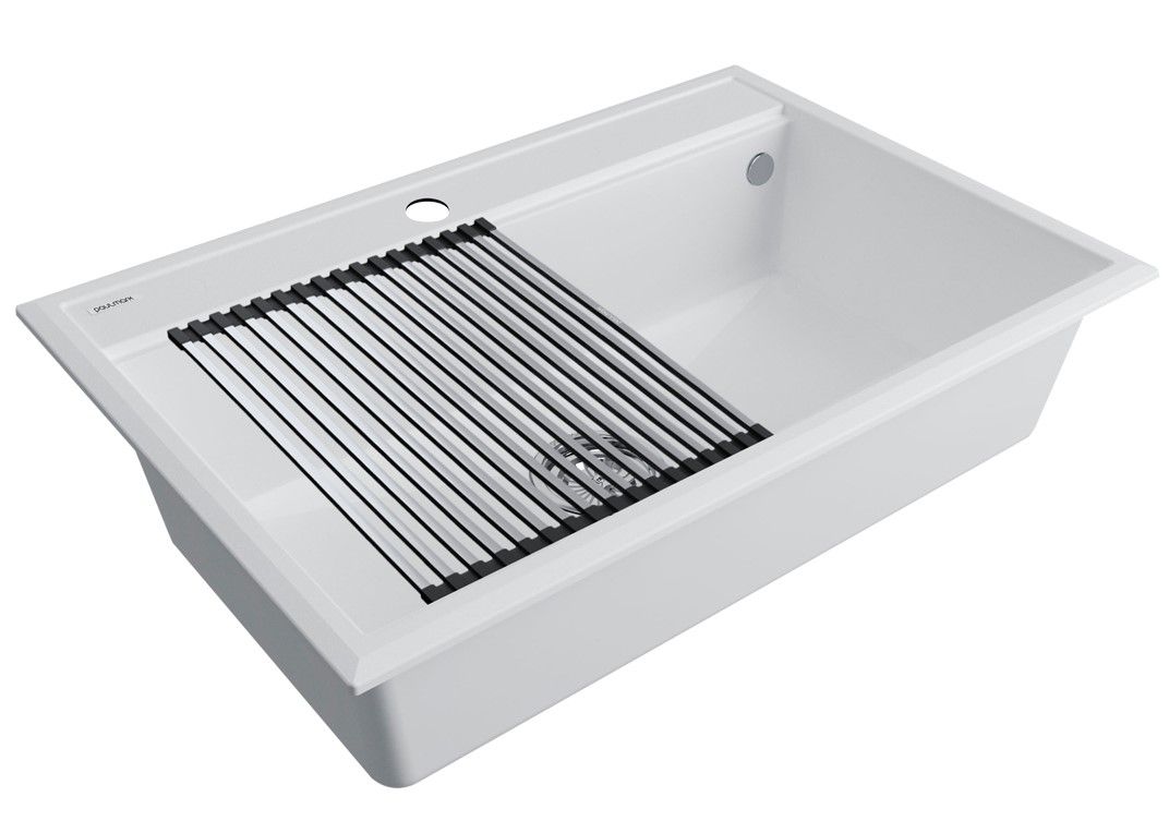 Комплект мойка STEPIA 80 + ролл-мат STEP, PM117551-WH+R375-BSСтильный и многофункциональный комплект мойки из композитного материала на основе гранита и ролл-мата из высококачественной нержавеющей стали для создания комфортной рабочей зоны на вашей кухне.Мойка STEPIA 80 изготовлена из IT-GRANIT – композитного материала на основе гранита, благодаря чему мойка не потеряет свой первоначальный цвет за многие годы использования даже при длительном воздействии солнечных лучей. Материал мойки устойчив к сколам, царапинам и деформациям. На горизонтальных гранях чаши мойки предусмотрены специальные выступы-ступеньки, которые позволяют использовать такие аксессуары, как ролл-маты, доски, коландеры и пр. для создания дополнительной рабочей поверхности на кухне. Дно чаши мойки имеет 4 грани, направленных к сливу под индивидуальным градусом для максимально быстрого ухода воды.