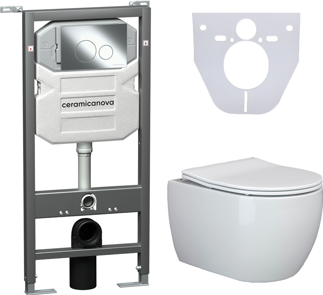 Сет 4 в 1: CN3001_1001CH_1000Подвесной унитаз PLAY Rimless арт. CN3001Шумоизоляционная панель для инсталляции арт. CN1000Система инсталляции для унитазов CERAMICANOVA Envision с кнопкой смыва Round цвет хром и креплениями, арт. CN1001CHПодвесной безободковый унитаз Ceramica Nova Play Rimless, крышка микролифт, CN3001