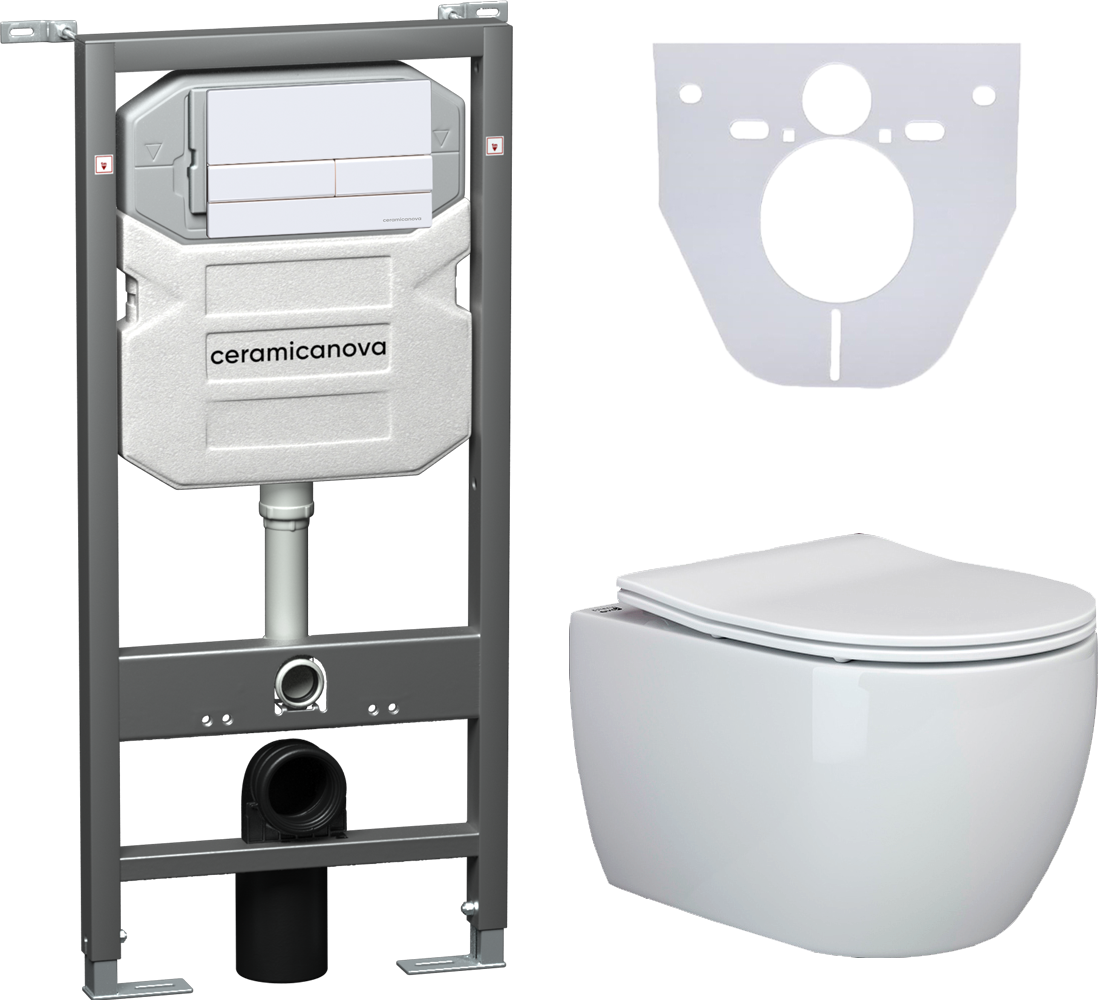 Сет 4 в 1: CN3001_1002W_1000Подвесной унитаз PLAY Rimless арт. CN3001Шумоизоляционная панель для инсталляции арт. CN1000Система инсталляции для унитазов CERAMICANOVA Envision с кнопкой смыва Flat цвет белый, креплениями, арт. CN1002WПодвесной безободковый унитаз Ceramica Nova Play Rimless, крышка микролифт, CN3001