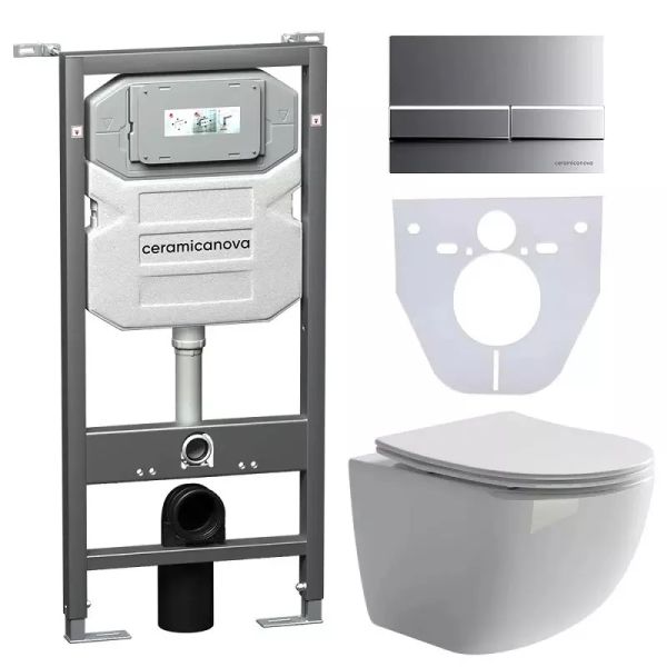 Сет 4 в 1: CN3009_1002M_1000Подвесной унитаз Forma Rimless арт. CN3009Шумоизоляционная панель для инсталляции арт. CN1000Система инсталляции для унитазов CERAMICANOVA Envision с кнопкой смыва Flat цвет хром матовый, креплениями, арт. CN1002M Подвесной унитаз Forma Rimless CN3009, глубокий смыв, с крепежом для полностью скрытого монтажа, ультра тонким с сидением и крышкой с функцией плавного закрытия, дюропласт.Шумоизоляционная панель для инсталляции CN1000