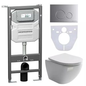 Сет 4 в 1: CN4002_1001M_1000Подвесной унитаз Metropol Rimless арт. CN4002Шумоизоляционная панель для инсталляции арт. CN1000Система инсталляции для унитазов CERAMICANOVA Envision с кнопкой смыва Round цвет хром матовый и креплениями, арт. CN1001MПодвесной унитаз Metropol Rimless CN4002, глубокий смыв, с крепежом для полностью скрытого монтажа, ультра тонким с сидением и крышкой с функцией плавного закрытия, дюропласт.