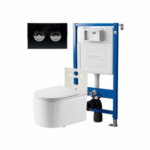 Комплект унитаза с инсталляцией Point Элемент PN48324BC с сиденьем МикролифтСет: Система инсталляции пневматическая Point Элемент П для подвесного унитаза PN45121 + Клавиша смыва для пневматической инсталляции Point Венера, установка в стену, черный/хром, PN44072BC + Унитаз подвесной Point Деметра безободковый, белый, сиденье дюропласт, микролифт быстросъемн PN41121