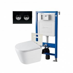 Комплект унитаза с инсталляцией Point Элемент PN48328BC с сиденьем МикролифтСет: Система инсталляции пневматическая Point Элемент П для подвесного унитаза PN45121 + Клавиша смыва для пневматической инсталляции Point Венера, установка в стену, черный/хром, PN44072BC + Унитаз подвесной Point Венера безободковый, белый, сиденье дюропласт микролифт быстросъемное PN41071