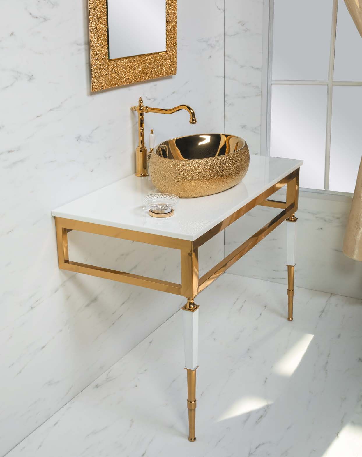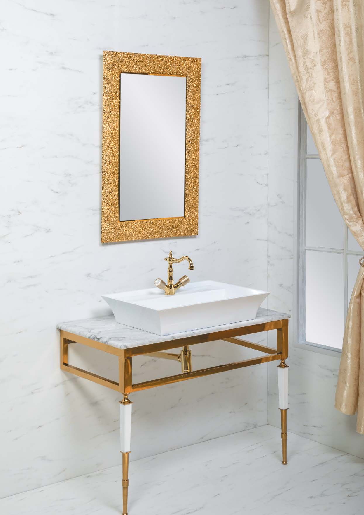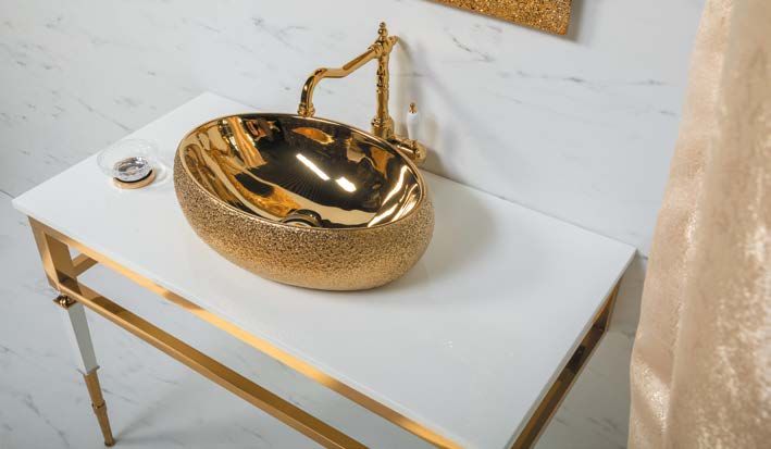 Консоль с раковиной Vogue шириной 100 см цветом золото.Консоли произведены из нержавеющей стали благодаря чему стойки к коррозии. Гальваническое покрытие исполнено в цветах хром и золото. Можно выбрать столешницу из мрамора, хрустального каленого стекла в различных цветовых исполнениях, и Solid Glass (передовой материал, в состав которого входит мраморная крошка и стекло). Раковины-чаши, которыми можно дополнть консоли, выполнены из Corian, хрустального стекла, керамики. Хорошим дополнением к консолям являются пеналы Armadi Art, а также сифоны, клик-клаки и смесители Boheme.Мебель можно дополнить пеналом и зеркалом
