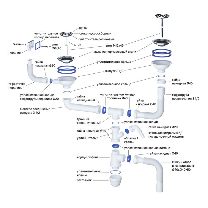 Есть все для монтажа: выпуск, сифон, уплотнительная лента, крепеж.