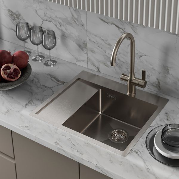 Мойка Haze отличается современным дизайном и ручным методом производства, что позволяет добиться идеальной геометрии – малый радиус скругления углов увеличивает рабочее пространство без «слепых» зон. Удобно разместить много посуды и мыть крупные предметы. Подходит для шкафа от 45 см.