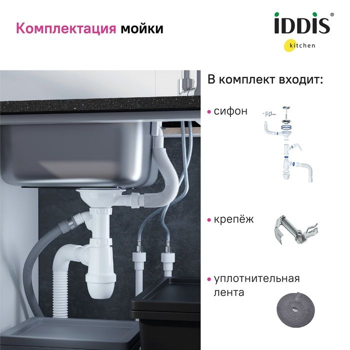 Сифон с отдельным отводом для стиральной/посудомоечной машины с обратным клапаном и гофрированными отводами для удобства подключения. Гарантия на стальные мойки IDDIS® – 15 лет, на сифон – 2 года, на крепления и выпуск – 1 год.