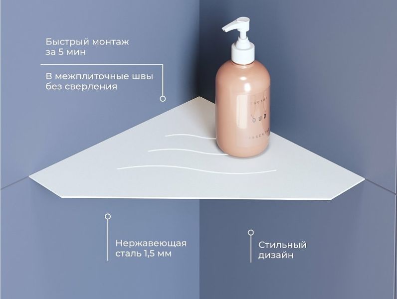 Металлическая полка RGW MT-03W 49279903-01 угловая БелаяПолка для душевой зоны RGW MT - современное решение для душевого пространства. Изготовлены из нержавеющей стали AISI 304, прочные, не ржавеют. Форма и размер полки, позволяет достичь максимальной стабильности конструкции и достаточной вместительности душевых принадлежностей, а легкая и быстрая установка в межплиточные швы без сверления плитки выгодно выделяет данное решение. Легкий монтаж без сверления плитки: Полки для душевой зоны, разработанные специально для монтажа после завершения ремонта, т. е. укладки плитки. Легко устанавливаются в любые угловые зоны в помещении, для этого прорезается шов между плитками, далее полочка вклеивается между плиткой на любой бытовой герметик. Полочки для душевой зоны RGW MT идеально подойдут для установки в душевое пространство, или в любую комнату, а так же найдут применение, на кухнях или в других помещениях.
