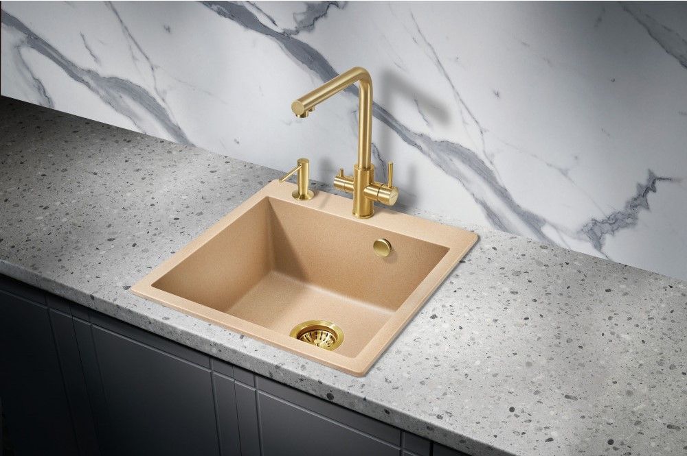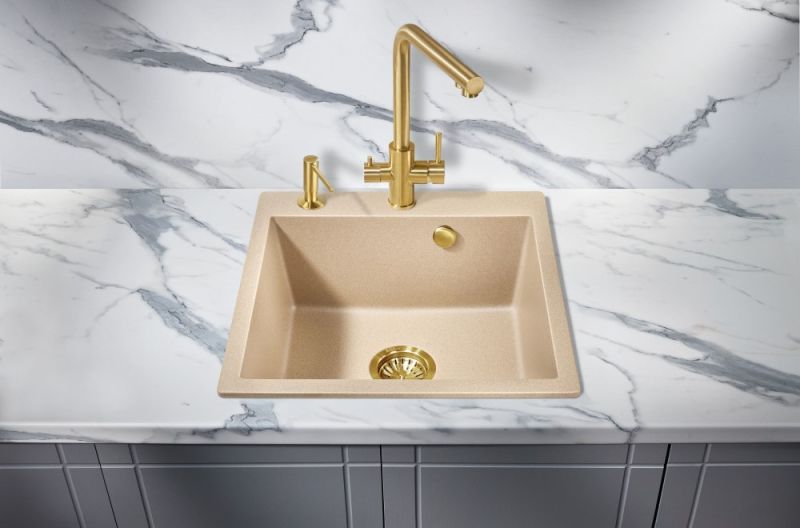 Врезная каменная прямоугольная мойка для кухни MILACIO Murcia 51 Cuarzo (MC.77024), выполненная в бежевом матовом цвете, станет украшением любой кухни — как классического, так и современного стиля. Раковина изготовлена из искусственного камня — кварца, или кварцевого композита, — твердого, долговечного материала, устойчивого перед любыми химическими веществами, экстремальными температурами и повреждениями. Имеет одну глубокую вместительную чашу квадратной формы, благодаря чему очень удобна в эксплуатации. Водоотталкивающее покрытие не дает каплям растекаться по поверхности, сводя к минимуму уровень загрязнения. А шумоподавляющие свойства материала не позволяют мойке греметь при наполнении водой и мытье посуды. Компактный сифон с выпуском и переливом сохранит много полезного места в тумбе под раковиной.