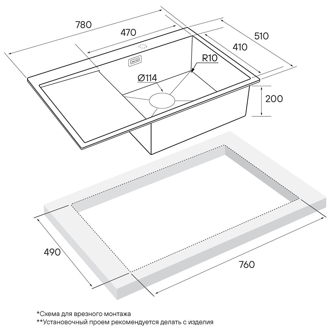 • Отверстия под смеситель: