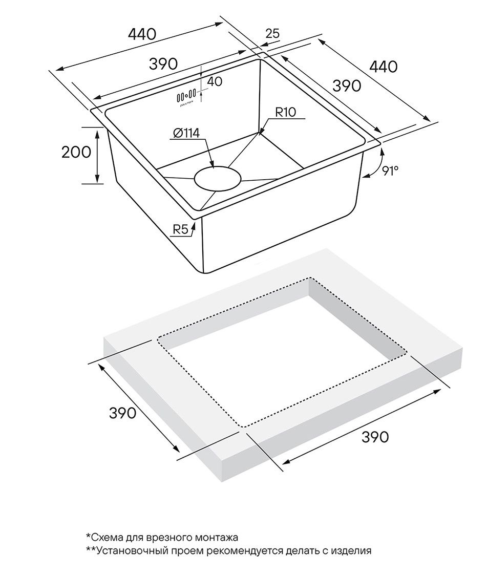 • Отверстия под смеситель: