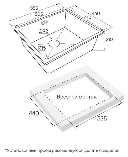 Мойка создана как для современного способа монтажа под столешницу, так и для классического врезного монтажа.Практичная эстетика