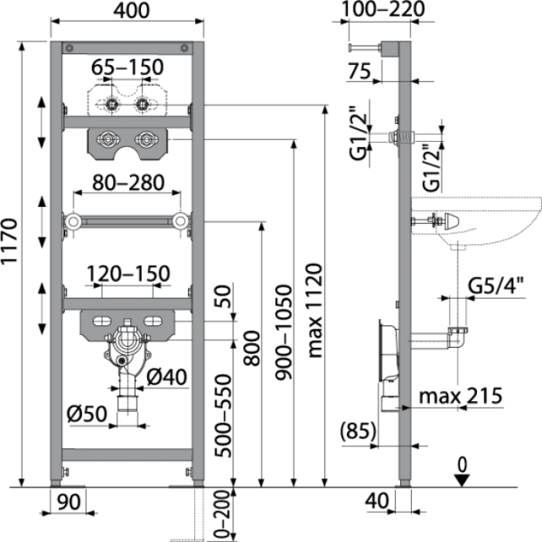 • Интервал крепления умывальника 80-280 мм