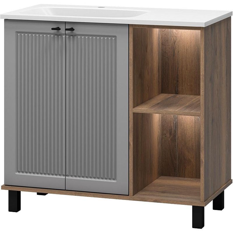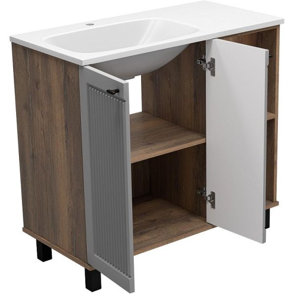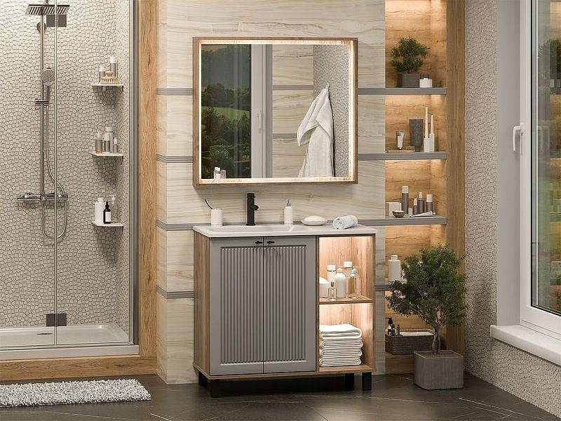 Тумба с раковиной Brevita Lumus 90 L УТ000025489 напольная с подсветкой. Lumus - свет, стиль и практичность. Коллекция Lumus создана для тех, кто ценит современные решения, функциональность и стильные акценты в интерьере. Особенность этой мебели - открытые ниши с подсветкой, которые не только создают уютную атмосферу, но и делают хранение удобнее. Контрастное сочетание оттенков придаёт коллекции выразительность: эмалированные фасады и корпус из ЛДСП идеально дополняют чёрные металлические ручки и регулируемые опоры. Все элементы продуманы до мелочей: петли с доводчиками гарантируют плавное закрывание дверей, а премиальные материалы обеспечивают долговечность и надёжность. Это мебель, которая смотрится эффектно в любом интерьере, подчёркивая внимание  к деталям. Lumus - это больше, чем просто мебель. Это игра света и тени, стиль, который привлекает внимание, и комфорт, который ощущаешь каждый день. Характеристики: Тумба под раковину: