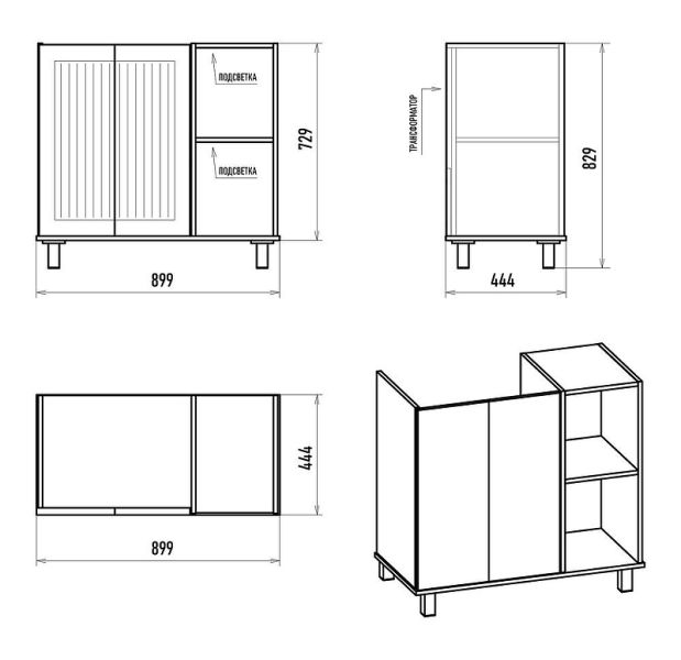 Габариты корпуса тумбы (ШхВхД): 899х829х444 мм.