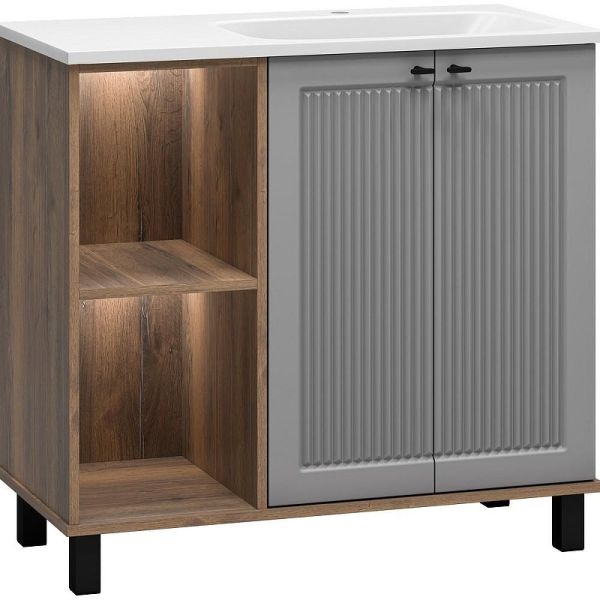 Тумба с раковиной Brevita Lumus 90 R УТ000025490 напольная с подсветкой. Lumus - свет, стиль и практичность. Коллекция Lumus создана для тех, кто ценит современные решения, функциональность и стильные акценты в интерьере. Особенность этой мебели - открытые ниши с подсветкой, которые не только создают уютную атмосферу, но и делают хранение удобнее. Контрастное сочетание оттенков придаёт коллекции выразительность: эмалированные фасады и корпус из ЛДСП идеально дополняют чёрные металлические ручки и регулируемые опоры. Все элементы продуманы до мелочей: петли с доводчиками гарантируют плавное закрывание дверей, а премиальные материалы обеспечивают долговечность и надёжность. Это мебель, которая смотрится эффектно в любом интерьере, подчёркивая внимание  к деталям. Lumus - это больше, чем просто мебель. Это игра света и тени, стиль, который привлекает внимание, и комфорт, который ощущаешь каждый день. Характеристики: Тумба под раковину: