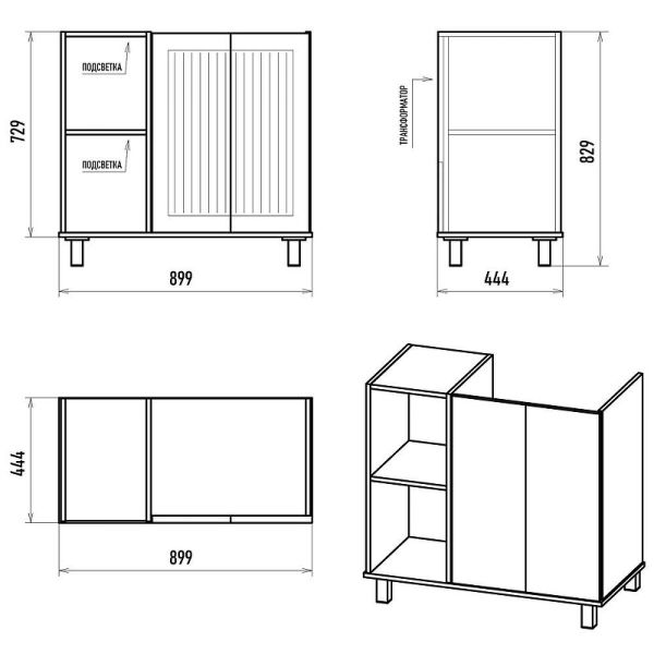 Габариты корпуса тумбы (ШхВхД): 899х829х444 мм.
