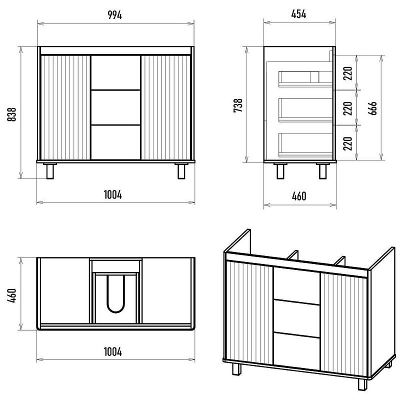 Габариты корпуса тумбы (ШхВхД): 1004х838х460 мм.