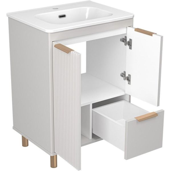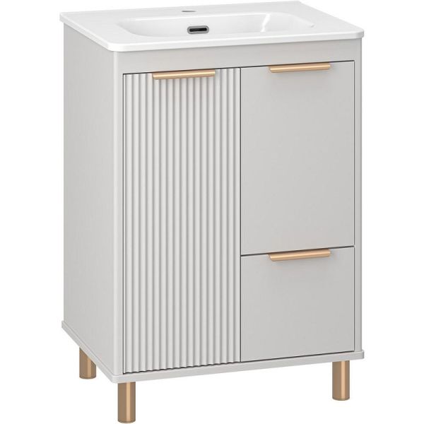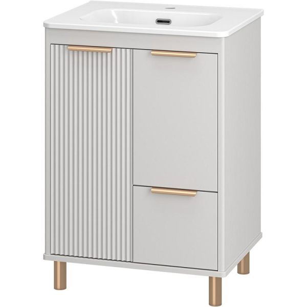 Тумба с раковиной Brevita Risacca Crema 60 УТ000025678 напольная. Risacca – итальянская элегантность и безупречное исполнение. Итальянский стиль узнаваем с первого взгляда: он лаконичен, утончён, пропорционален и по-настоящему выразителен. Коллекция Risacca вобрала в себя всё лучшее от эстетики итальянского дизайна: гармония линий, внимательное отношение к деталям и продуманный комфорт. Фасады тумб выполнены в эмали с элегантной фрезеровкой, подчёркивающей премиальный статус коллекции. Тумбы представлены в разных размерах, позволяя адаптировать пространство ванной комнаты под любые запросы. Благодаря качественной фурнитуре, доводчикам и направляющим скрытого монтажа, каждый элемент мебели работает плавно и безупречно. Тумбы комплектуются керамическими раковинами Brevita Onda, которые идеально дополняют общий стиль, создавая   единый, цельный образ. Это мебель, в которой внимание к деталям делает повседневный комфорт особенным. Коллекция Risacca – это не просто мебель для ванной комнаты, это итальянское вдохновение, которое превращает интерьер в произведение искусства. Характеристики: Тумба под раковину: