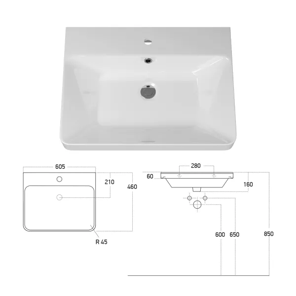 Размер раковины, мм (ш/г/в): 605x460x160