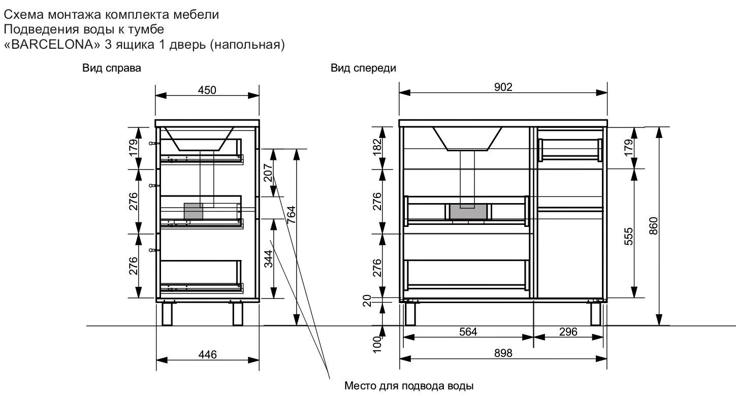 Напольная тумба под раковину Эстет Barcelona ФР-00003581 П 90см три ящика одна дверь