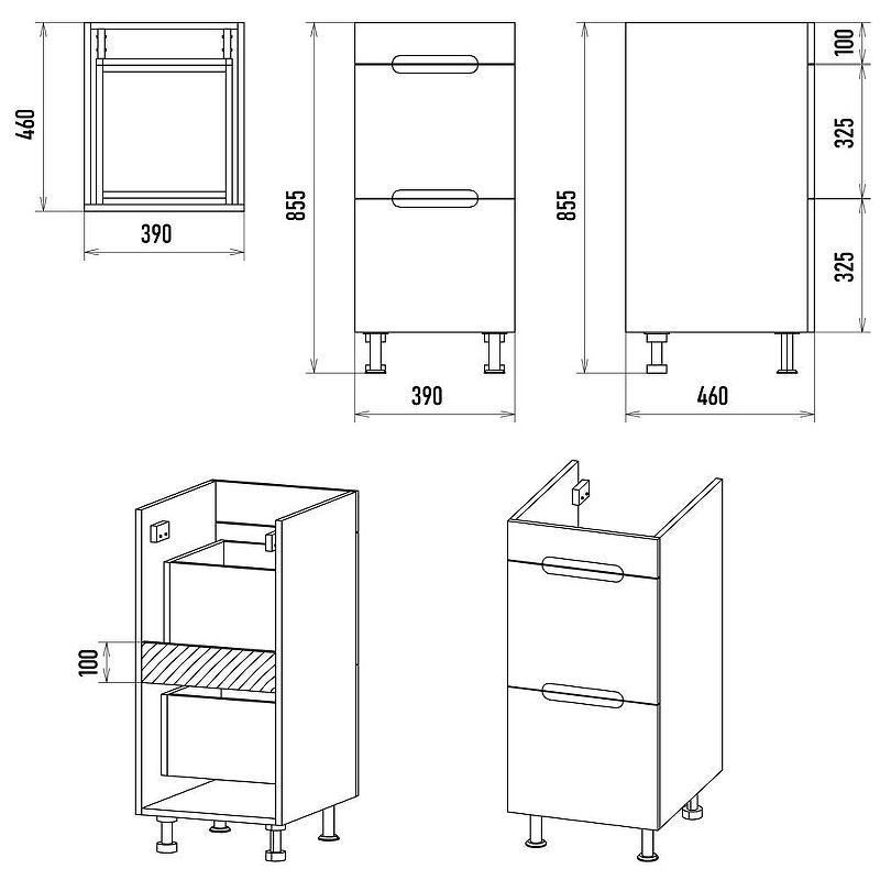 Габариты корпуса тумбы (ШхВхД): 390х855х460 мм.