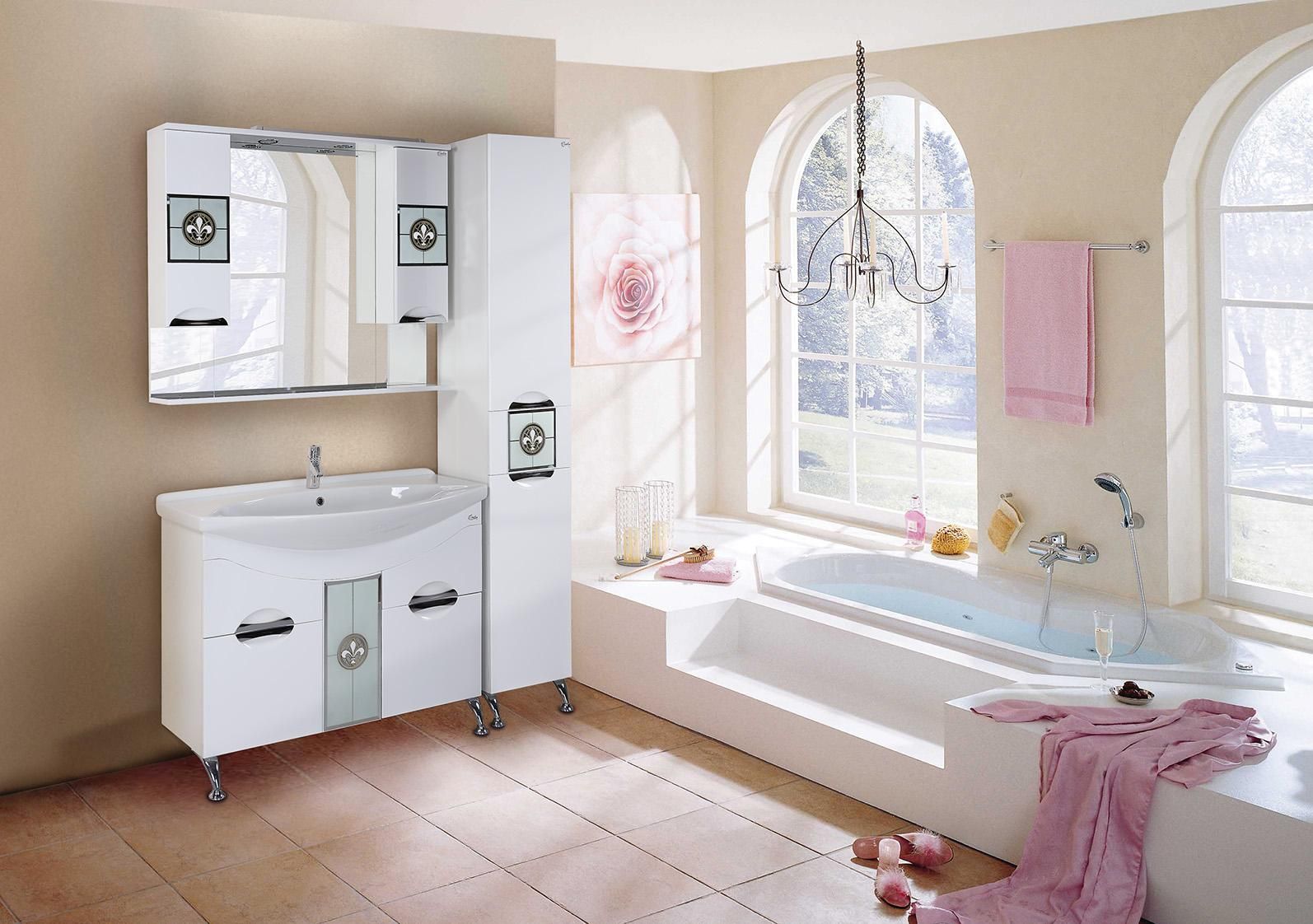 Глянцевый белый цвет подчеркивается врезными хромированными ручками, изысканный стиль тумбы дополняет декоративный витраж на зеркальном полотне.