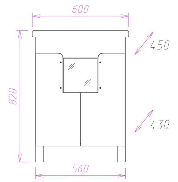 Размеры тумбы без учета раковины и ножек 56x43x68 cм.