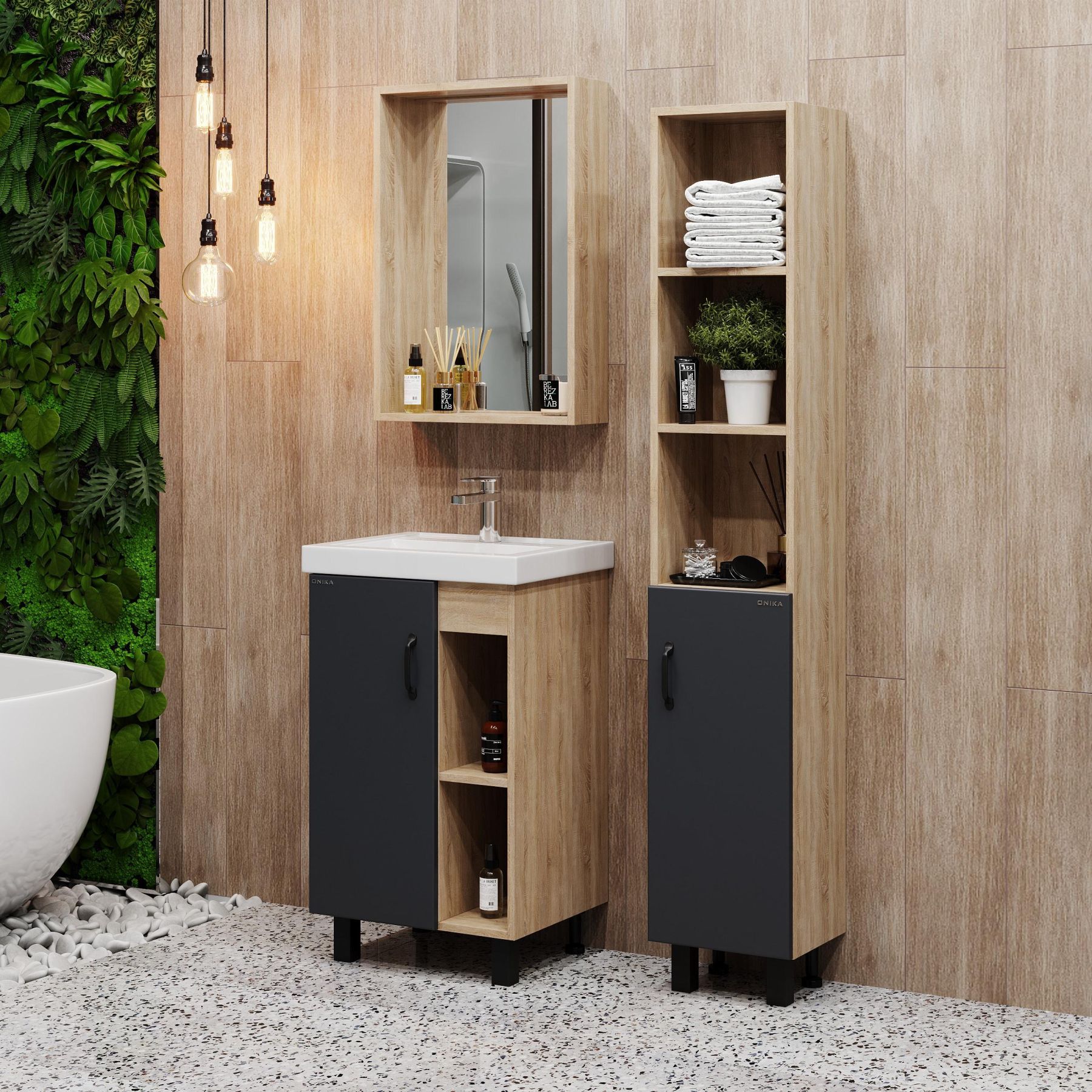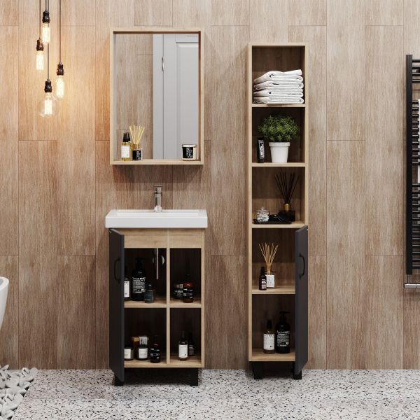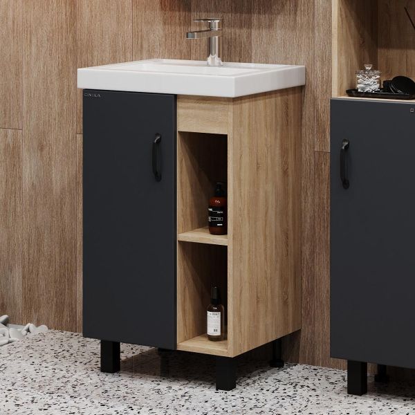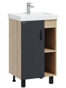 В тумбе Onika Тимбер 50 удачно сочетаются контрастные цвета и фактуры: серый матовый фасад с покрытием SoftTouch, корпус цвета дуба с роскошной текстурой, черная матовая металлическая фурнитура.
