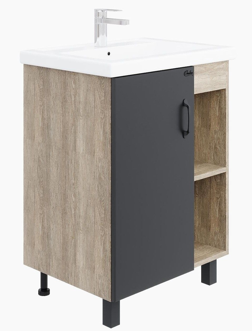 В тумбе Onika Тимбер 60 удачно сочетаются контрастные цвета и фактуры: серый матовый фасад с покрытием SoftTouch, корпус цвета дуба с роскошной текстурой, черная матовая металлическая фурнитура.