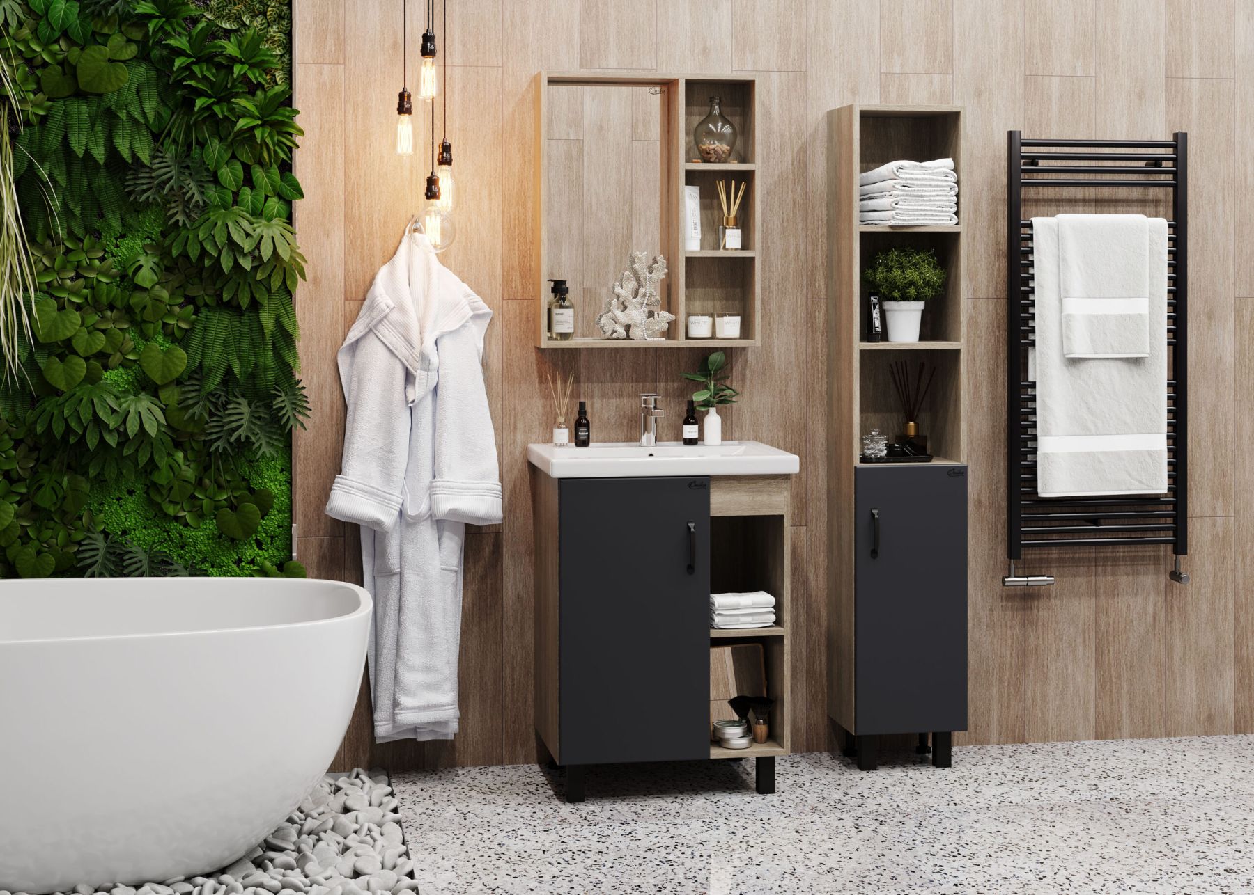 Открытые полки справа обеспечивают быстрый доступ к часто используемым аксессуарам, а пространство за распашной дверцей слева, снабженной системой плавного закрывания, станет удобным местом для хранения различных бытовых принадлежностей.
