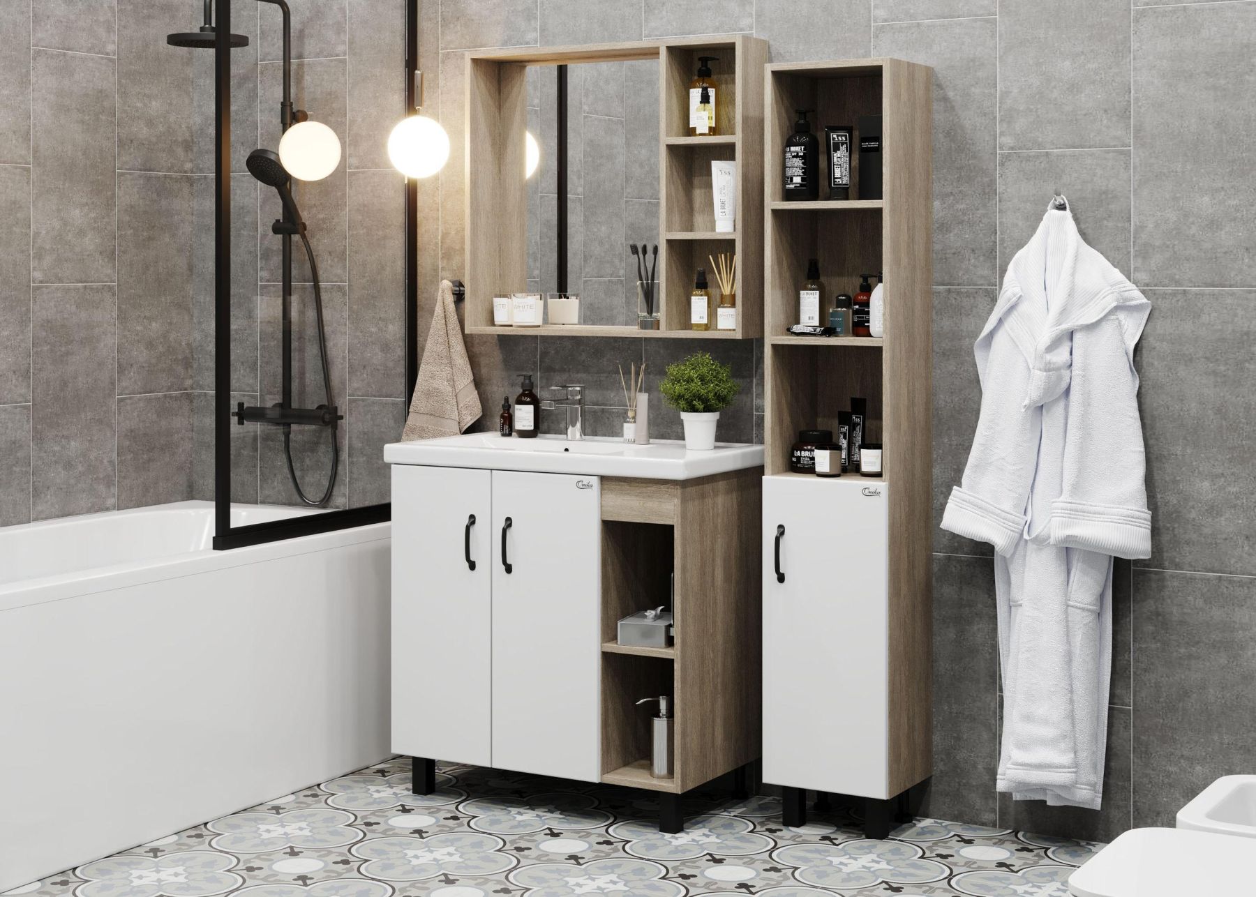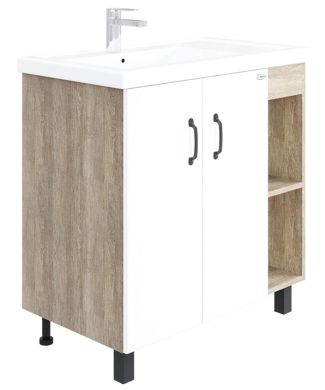 В тумбе Onika Тимбер 80 удачно сочетаются контрастные цвета и фактуры: белый матовый фасад с покрытием SoftTouch, корпус цвета дуба с роскошной текстурой, черная матовая металлическая фурнитура.