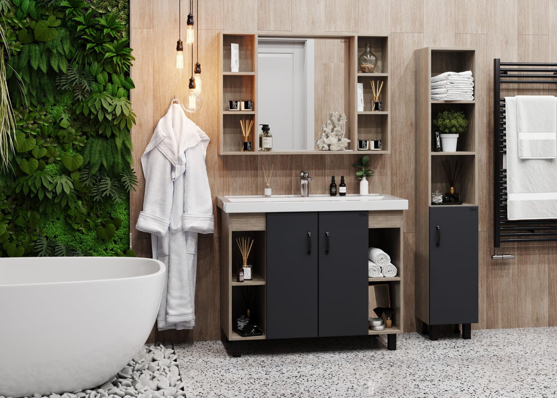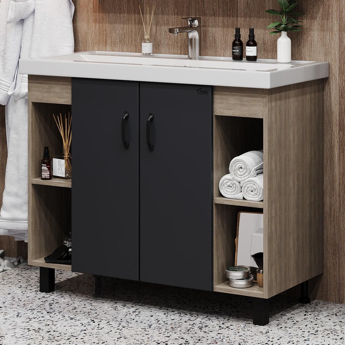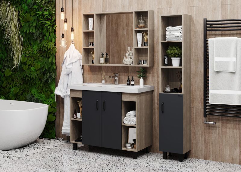 Открытые полки по бокам от основного отделения обеспечивают быстрый доступ к часто используемым аксессуарам, а пространство за распашными дверцами с доводчиками по центру тумбы, станет удобным местом для хранения различных бытовых принадлежностей.