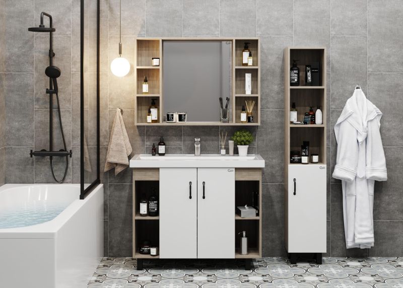 Открытые полки по бокам от основного отделения обеспечивают быстрый доступ к часто используемым аксессуарам, а пространство за распашными дверцами с доводчиками по центру тумбы, станет удобным местом для хранения различных бытовых принадлежностей.