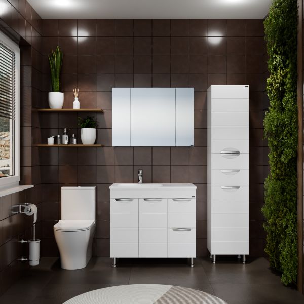 О коллекции: Коллекция Родос - современная и стильная мебель по приемлемой цене. Фасадные и боковые стенки мебели выполнены из МДФ покрытого ПВХ плёнкой. Тумба напольная "Родос 90" для умывальника "Венера 90". Тумба имеет оптимальную организацию внутреннего пространства. Комплектуется современной прямоугольной раковиной из литьевого мрамора с удобным крылом.