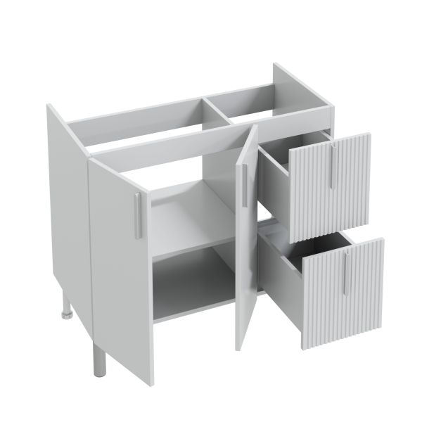 Фасады и боковины выполнены из МДФ и покрыты глянцевой эмалью. Её дверцы оснащены петлями плавного закрывания, а ящики оборудованы доводчиками нижнего монтажа. Ящики отличаются стильным дизайном, они выполнены с вертикальной реечной фрезеровкой.