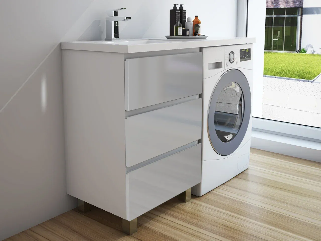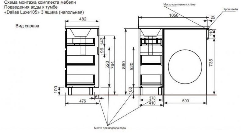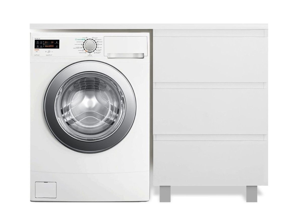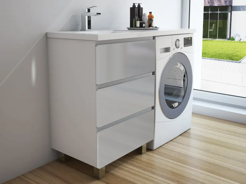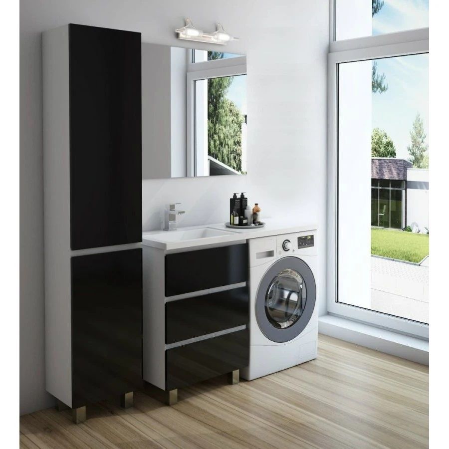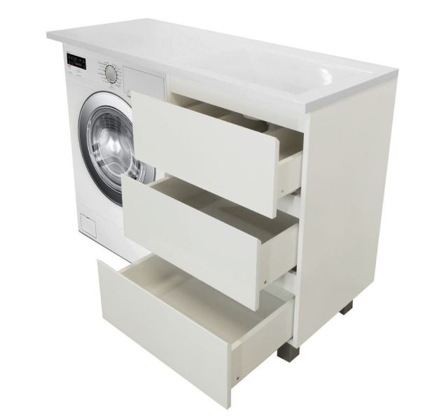 Приоритетом в выборе тумбы с раковиной является площадь ванной комнаты. Функциональная тумба с тремя ящиками решит вопрос для большинства покупателей. Тумба укомплектована раковиной из литьевого мрамора с удобной чашей, стиральная машина устанавливается под столешницей. Три ящика позволят распределить как крупные, так и мелкие вещи.