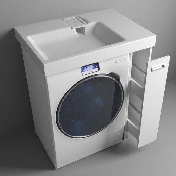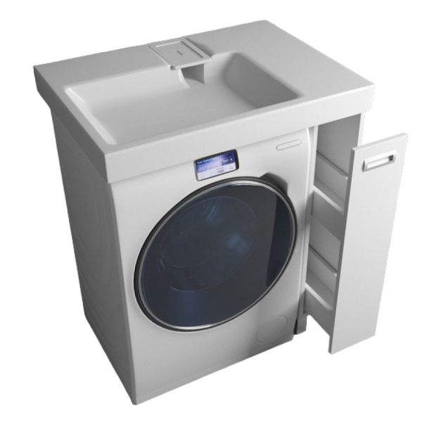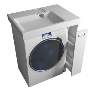 Простые и четкие линии тумбы идеально впишутся в интерьер в стиле «минимализм», а компактная раковина из литьевого мрамора установленная над стиральной машиной, позволяет сэкономить место в ванной комнате.