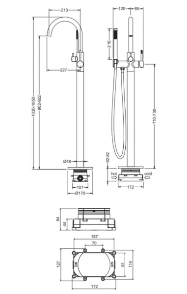 - Напольный смеситель для ванны с душевым гарнитуром