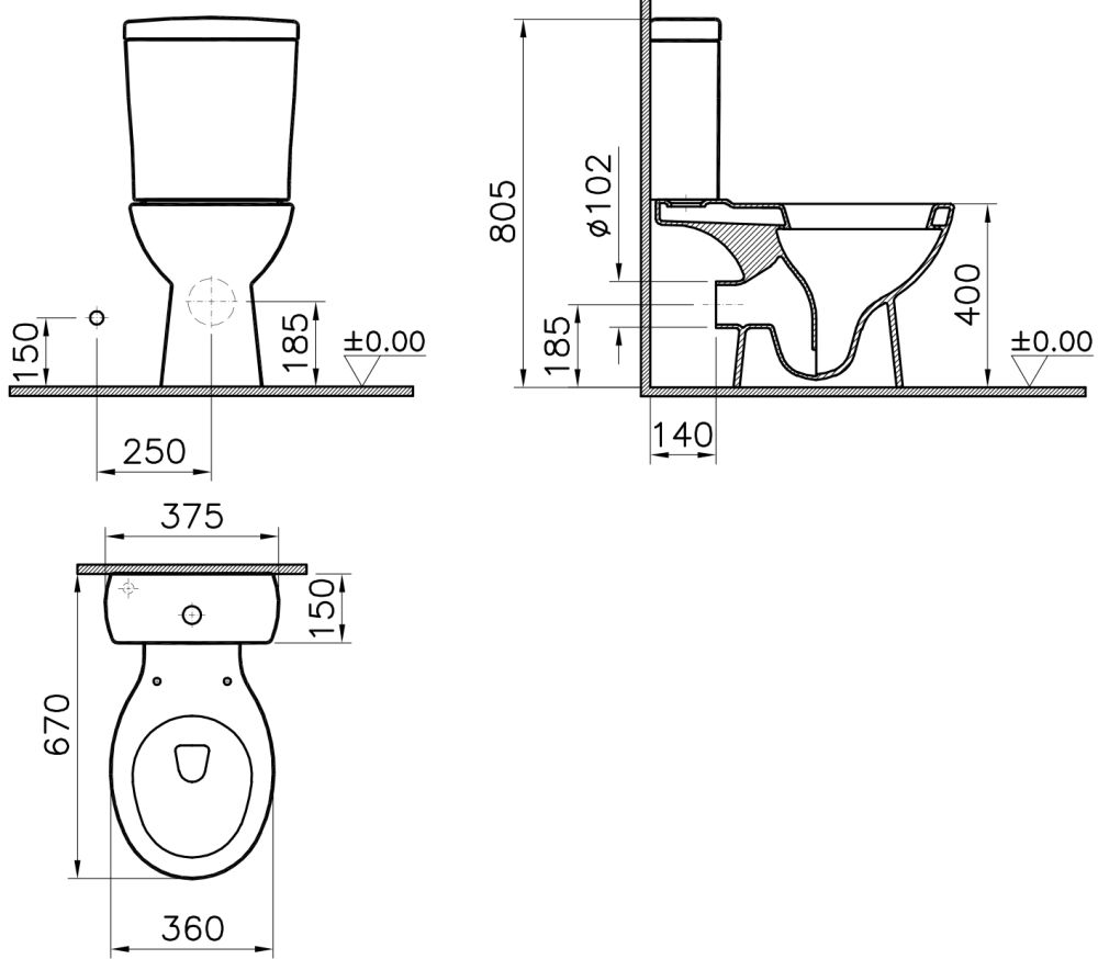 • Прилегание унитаза к стене:
