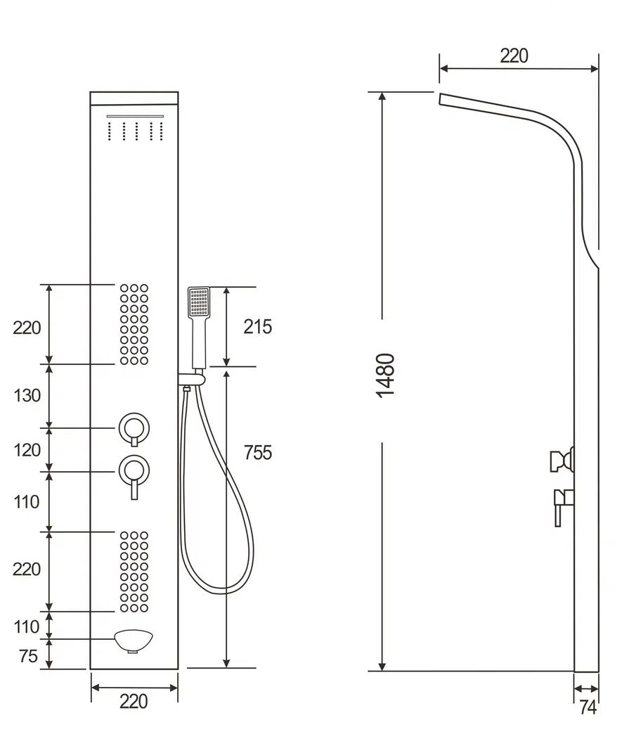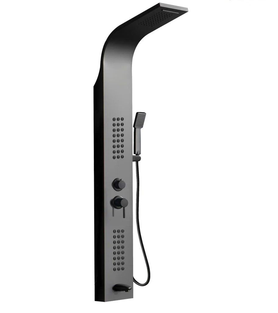 Комплектация: душевая панель, душевая лейка, смеситель, шланг для душа, верхний душ, крепеж, инструкция